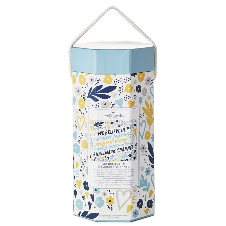 Take a step back from busy workdays and school days with a night of puzzling and movie-watching fun. This 1000-piece Hallmark Channel jigsaw puzzle features a modern floral and hearts design in yellow, gray, aqua and navy surrounding a charming quote. Packaged in a unique, octagonal box with carrying handle, this puzzle makes a great gift idea for a newly married couple or your own Hallmark Channel-loving family.